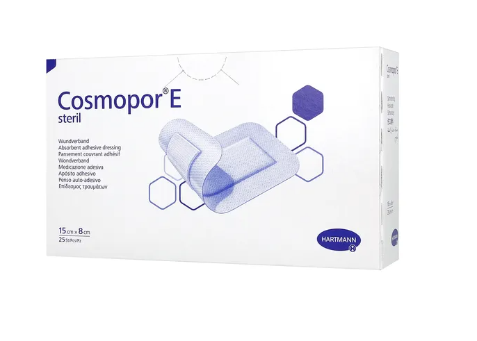 Wyrób medyczny Cosmopor E to samoprzylepny, 3-warstwowy opatrunek na rany i skaleczenia do skóry wrażliwej posiadający hydrofobową warstę kontaktową nieprzywierającą do rany.