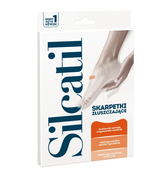 Skarpetki złuszczające skutecznie zmiękczają skórę oraz zmniejszają grubość warstwy rogowej naskórka, usuwają wszelkie zrogowacenia, odciski i zgrubienia. Skarpetki doskonale nawilżają skórę stóp, pozostawiając ją miękką i jedwabiście gładką. Skarpetki Silcatil to bezpieczny i niezwykle prosty zabieg do samodzielnego wykonania w domu.